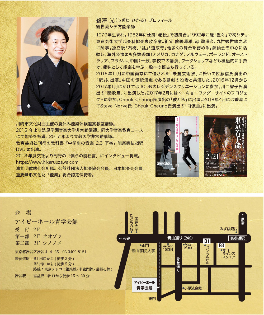 無から有を生み出し、また無に戻ると言われる「能」。引き算の美学の芸能とも言われますが、余白を作ることで表現の自由度を増加させ、観客にインスピレーションを与える能楽をヒントに、日本における美とは何なのか、表現者の視点から解き明かします。講演の終わりには、春を祝する仕舞の鑑賞をお楽しみください。